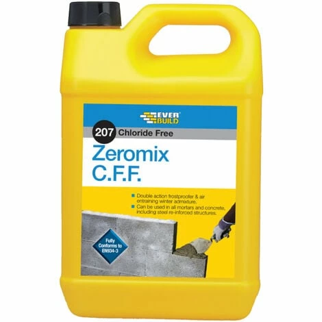Everbuild 207 Zeromix CFF 25 Litre (ZEROM25) EVERBUILD ZEROMIX CFF is air entraining chloride free liquid admixture for mortar and concrete which also acts as an accelerator for work in sub – zero temperatures. Improves workability and freeze/thaw resistance in brick laying mortars and eliminates the need for a separate frostproofer. Conforms to EN934-3 (2009)An air entraining liquid admixture for mortar and concreteAlso acts as an accelerator for work in sub-zero temperaturesImproves workability and freeze/thaw resistance in brick laying mortarsNon-corrosive to embedded metalReduces shrinkage- cracking and crazing reduced