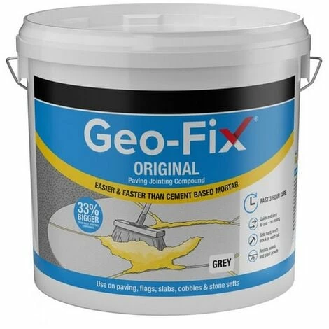 A ready to use self setting permanent joint filler for all paving joints over 5mm wide. Unaffected by wind, rain washout and mechanical sweeping equipment. No mixing required. Apply by brush. Non staining. Up to 20 times faster to complete than traditional methods. Durable joints which are unaffected by frost, salt UVA and chemicals. Resists weed and plant growth between joints. Water and air permeable – allows for continued nourishment of tree and plant roots. Enables ornate paving patterns and designs to be jointed quickly. Supplied in a hermetically sealed 20kg pack. Store in a cool dry place out of direct sunlight. Protect the pack from punctures or piercing. Any exposure to air will start the curing process. MUST BE USED BETWEEN 30 – 45 MINUTES OF OPENING PACKAGING. Please read FULL instructions carefully before opening packaging. Do not use in wet weather. Any contact with rain or water before the compound has set will adversely affect the product. Data Sheet Available. *PALLET DELIVERIES MAY INCURE ADDITIONAL DELIVERY CHARGES USUALLY £50*.Coverage: The figures given below are approximate quantities required at 25mm depth per 20kg of Geofix. Joint width 250 x 250mm 450 x 450mm 600 x 600mm5mm13.0m2 22.0m2 26.5m26mm11.0m2 19.0m2 22.0m27mm9.0m2 16.5m2 17.5m28mm7.8m2 14.5m2 16.5m29mm6.5m2 12.0m2 14.5m210mm5.8m2 11.0m2 13.0m2
