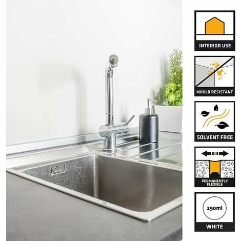 Ideal for use around kitchen worktops, baths, sanitary ware, basins, ceramics and door or window frames made from timber, metal or PVCu – not suitable for shower trays for this area use showerproof bathroom silicone due to its increased flexibility